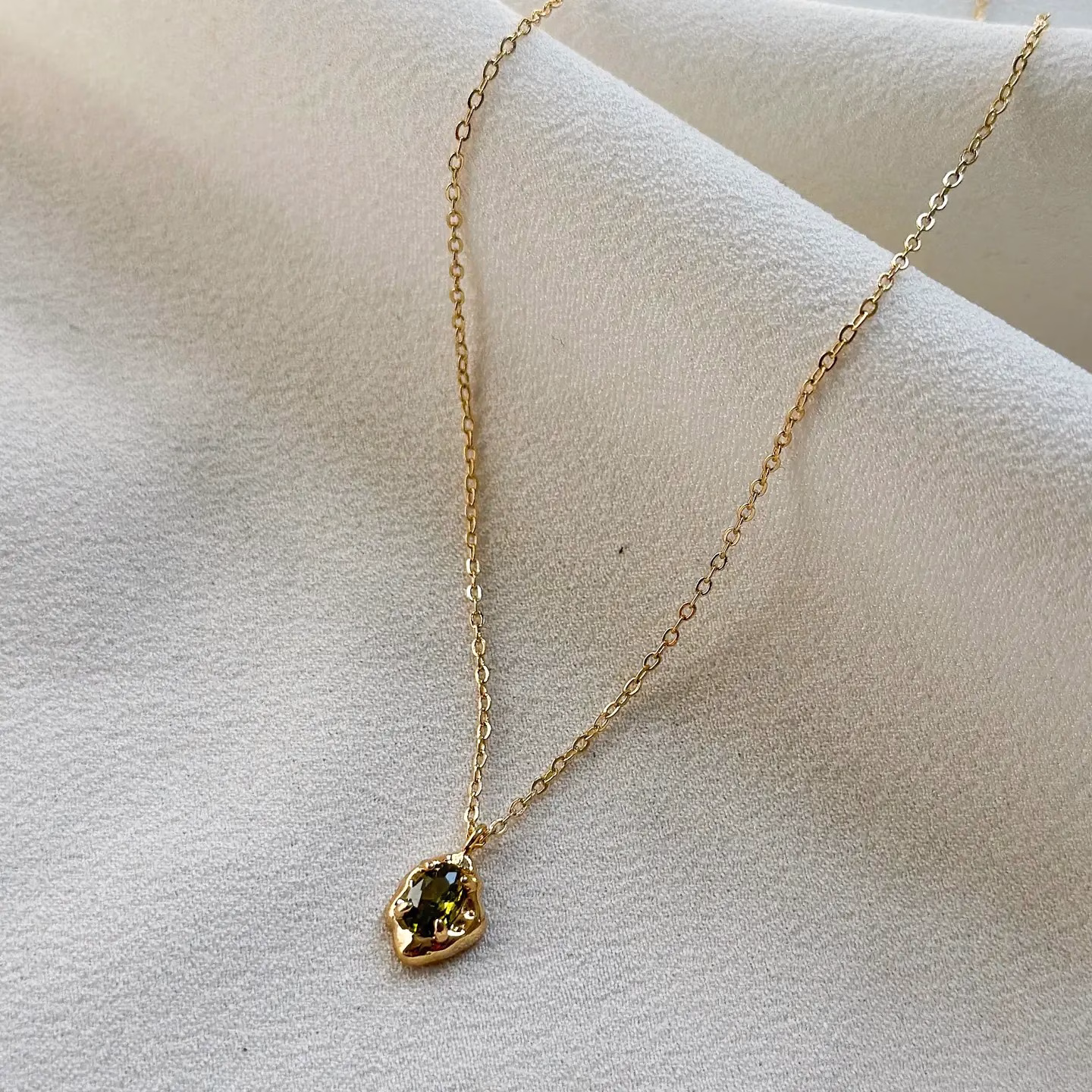 18k gold plated fine chain necklace with small molten pendant with a moss green cubic zirconia stone.