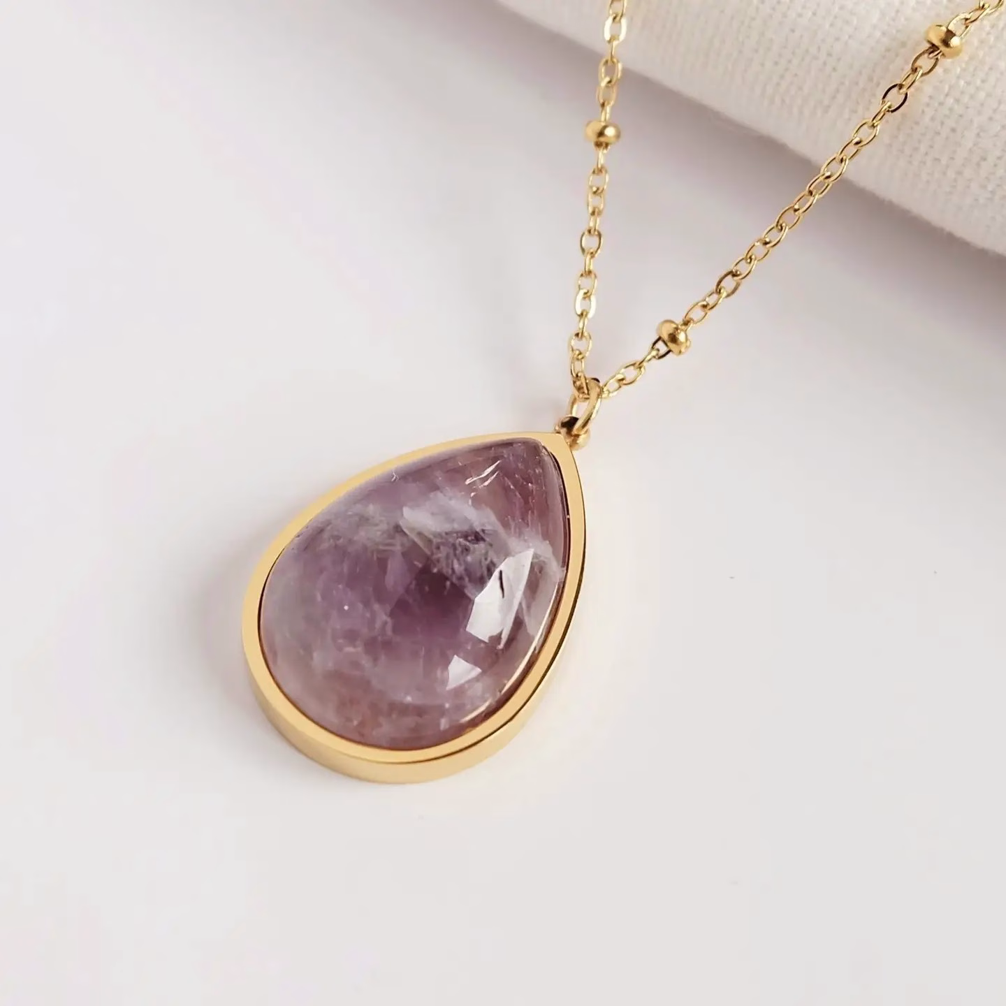 This graceful amethyst teardrop pendant hangs from a pretty satellite chain. Amethyst is connected to the third eye chakra, long regarded as a stone of intuition and inner strength, it adds a touch of magic to your every day. Each natural stone is unique, with slight variations in colour and markings, making every piece unique.
