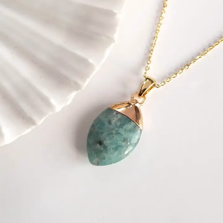 Materials: Natural Apatite gemstone and gold plated chain. Size: Apatite gemstone measures 1.5 x 2 cms. Adjustable from 17 – 19 inches.