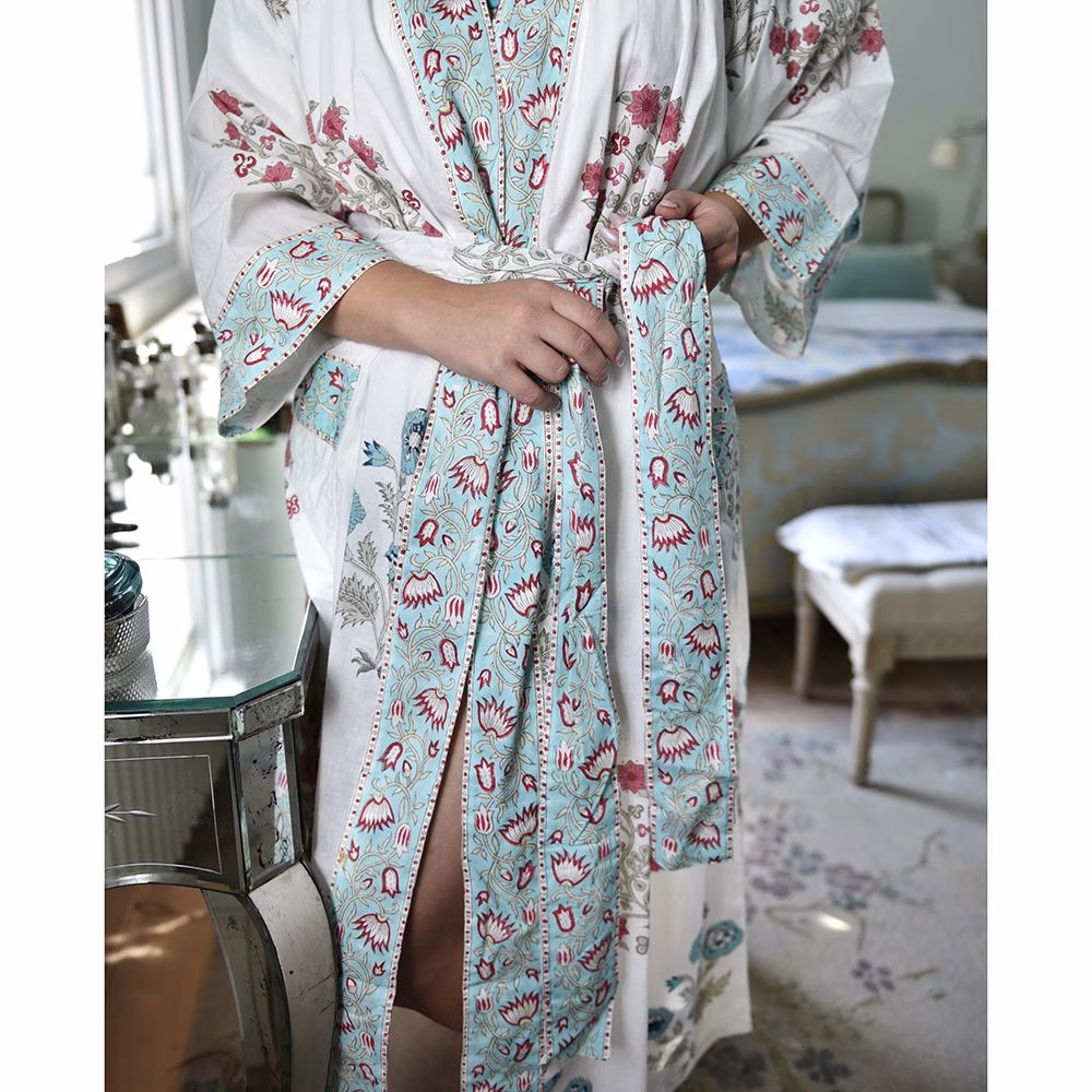 The pattern on this dressing gown is so fresh and pretty – flowering plants with blue and pink-red flowers and leaves outlined in light grey are block-printed on a crisp white background. The floral print is complimented by the contrasting blue printed border with garlands of flowers on the open front, cuffs, and pockets and the dressing gown fastens with a long tie belt. 100% Cotton