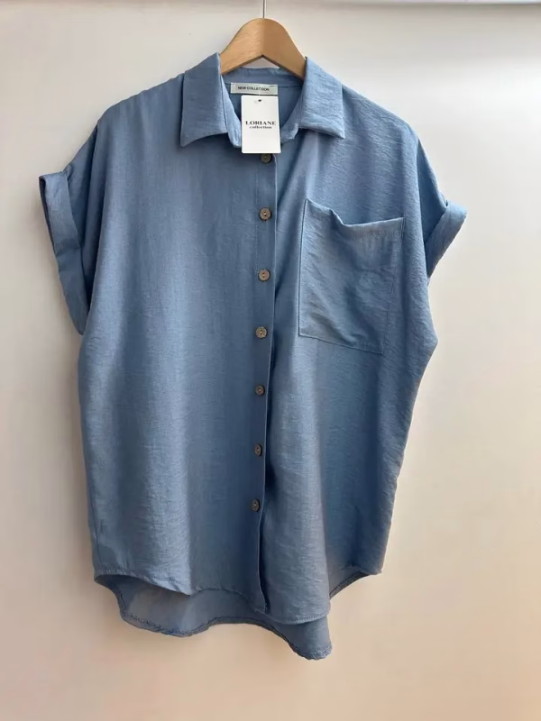 Simple short sleeve shirt in blue. Fabric: 87% viscose, 13% polyamide. Made in Italy.